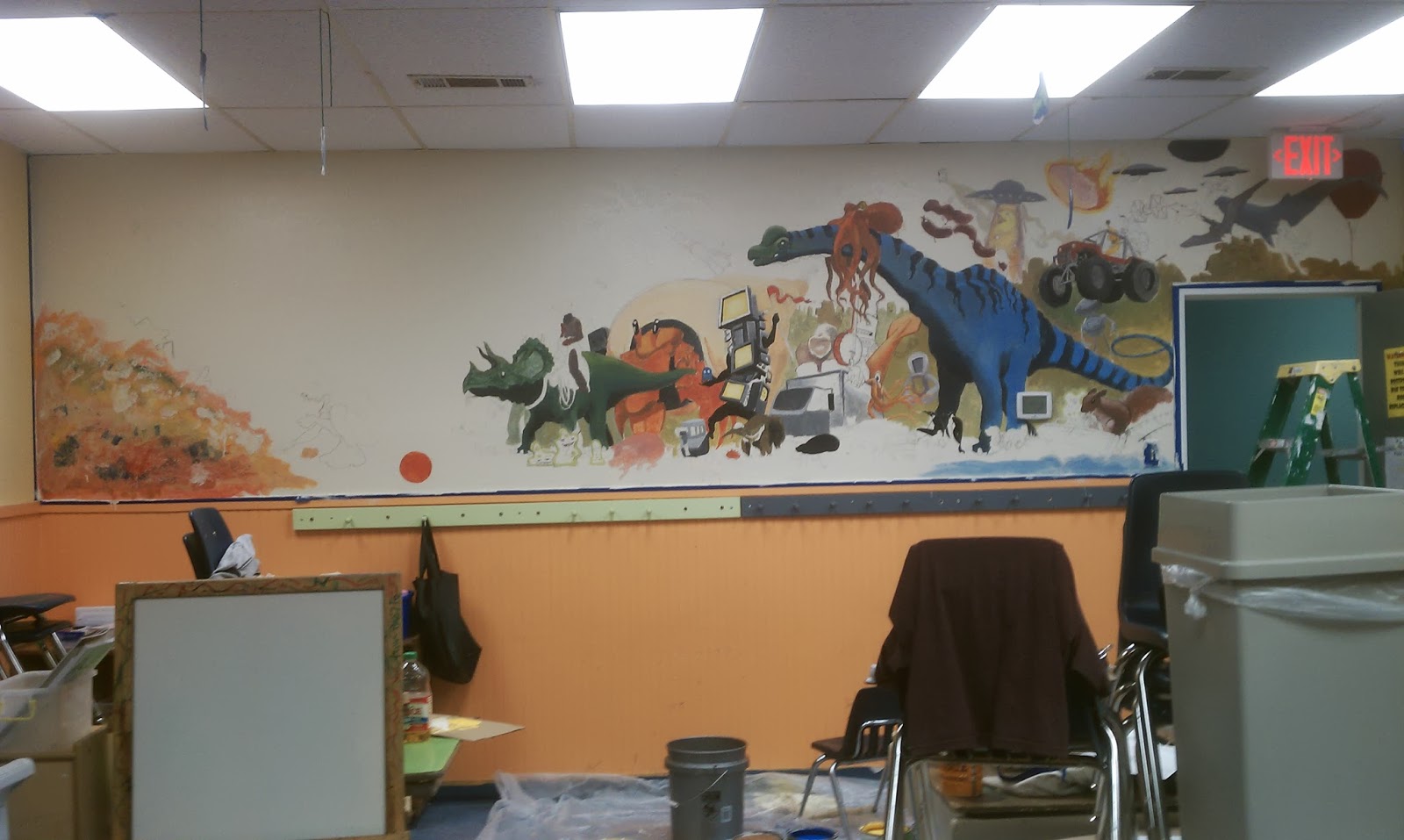 Well here is the mural as it stands. Not counting my week and a half road trip adventure..... I have certainly put some hours into it but i am really happy with where it's going. It is amazing how freaking long it takes to even block in colors on a painting this big... i can work all night and it doesn't look like i've done that much. but all the work is not in vain... when it's done i hope for this to be the flagship of a new and revamped and re-branded fire-breathing whiskey-drinking rock 'n rollin' portfolio complete with laser cannons.