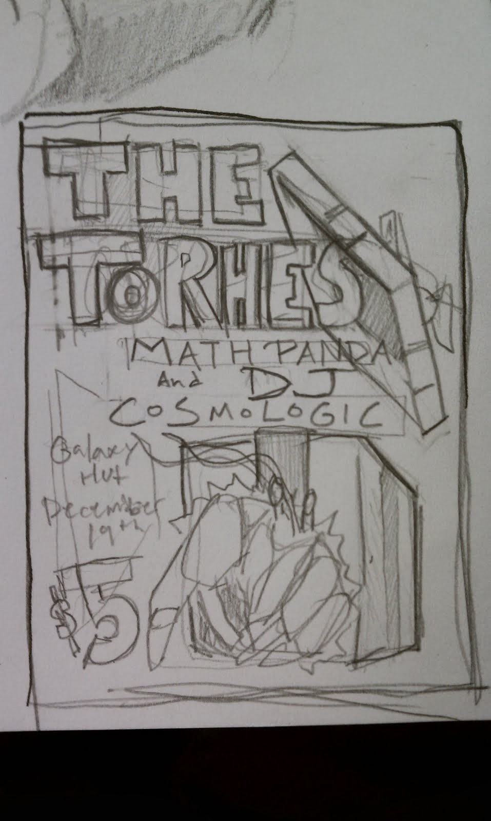 Yet another torches poster is in the works! They will be giving out a special gift at their upcoming show and the poster is meant to advertise that fact. still going to do a few more sketches to work out the details but the hermit crab is a sure thing. i love that guy. I have to say that my phone camera is really awesome. Who needs a scanner when you can just email yourself pics from your phone!? Kids these days and their internet cellphones. HA!